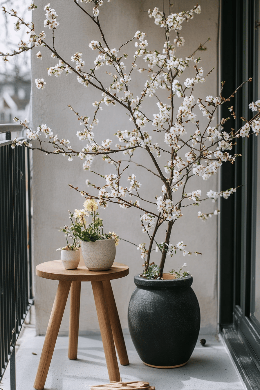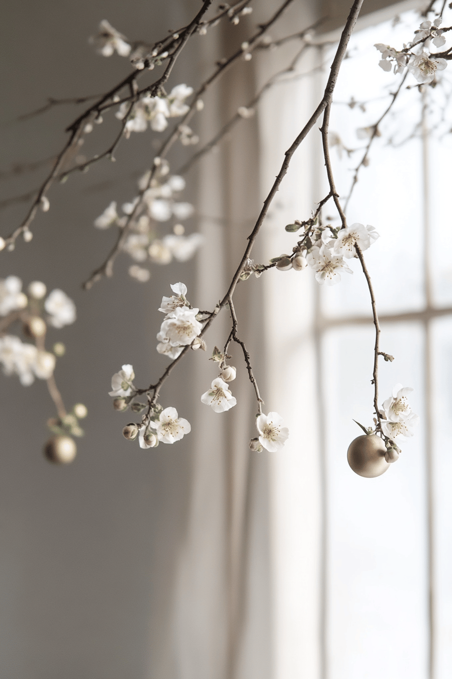 Verleihe Deinem Wohnraum lebendige Frische mit hängenden Zweigen, die mit Blüten und geschmackvollen Ornamenten verziert sind. Diese Idee lässt sich leicht umsetzen und fügt eine elegante Note hinzu.